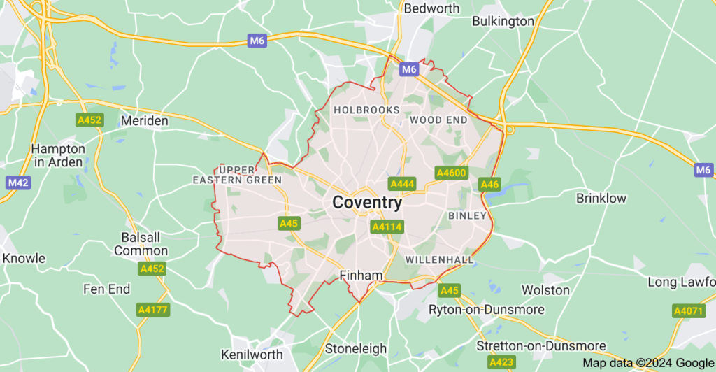 | Alderman’s Green Allesley Allesley Green Allesley Park Ash Green Ball Hill Bannerbrook Park Bell Green Binley Bishopsgate Green Brownshill Green Canley Cannon Park Chapelfields Cheylesmore Clifford Park | Copsewood Coundon Courthouse Green Daimler Green Earlsdon Eastern Green Edgwick Ernesford (or Ernsford) Grange Fenside Finham Foleshill Gibbet Hill Gosford Green Great Heath Green Lane Hearsall Common | Henley Green Hillfields Holbrooks Keresley Little Heath Longford Mount Nod Nailcote Grange Pinley Potters Green Radford Spon End Stivichall/Styvechale Stoke Stoke Aldermoor Stoke Heath | Tanyard Farm Tile Hill Toll Bar End Victoria Farm Walsgrave-on-Sowe Westwood Heath Whitley Whitmore Park Whoberley Willenhall Wood End Woodway Park Wyken |